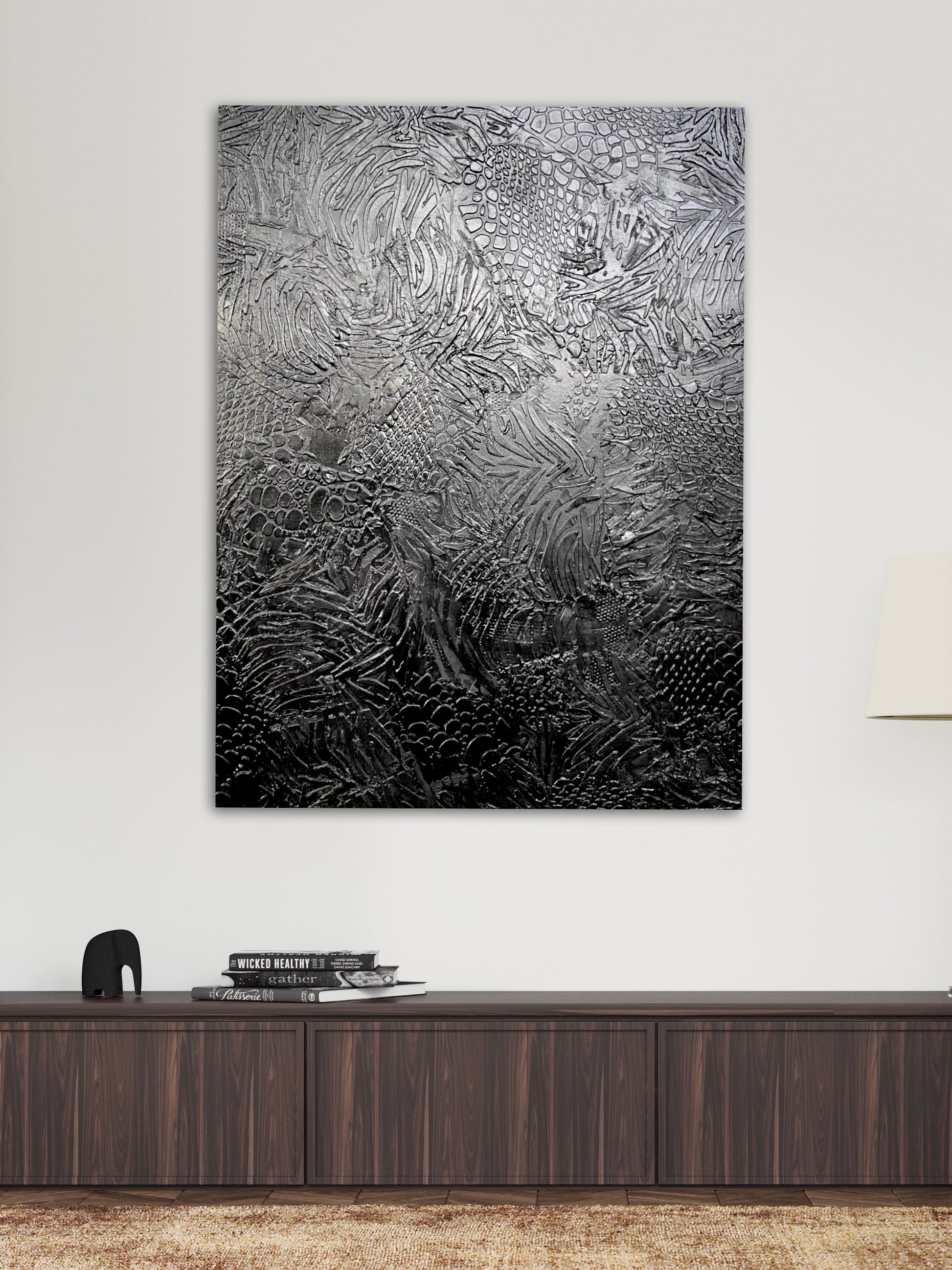 Exude Elegance with Animal Prints: Elevate your home with sophistication and allure through this captivating black textured zebra and snakeskin painting. The striking combination of these animal prints adds a touch of wild beauty to any space, creating a statement that ignites conversation. Embrace the timeless allure of nature and bring a sense of untamed grace to your surroundings, transforming your home into a sanctuary of refined style and captivating charm. At first glance, it portrays the elegance and mystique of the zebra, with its textured brushstrokes mimicking the animal's distinctive stripes. However, when exposed to different lighting conditions, a fascinating transformation occurs. The painting comes alive, revealing subtle variations of black, showcasing a rich interplay of shadows and highlights. This dynamic artwork serves as a reminder that perception is ever-evolving, just as the zebra adapts to its environment. As light dances upon its surface, the painting's hidden depths emerge, reminding us of the infinite dimensions of beauty and the ever-shifting nature of art.